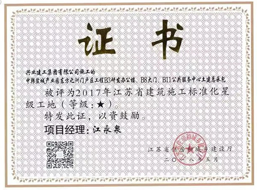 中韓鹽城產(chǎn)業(yè)園東方之洲門戶區(qū)B3研發(fā)辦公樓、B8大門、B11公共服務(wù)中心土建總承包工程榮獲“2017年度江蘇省建筑施工標(biāo)準(zhǔn)化星級工地”。