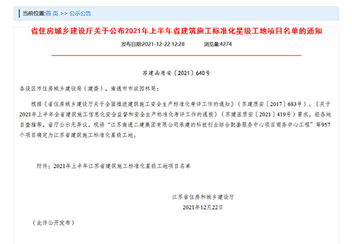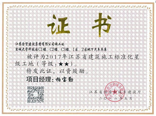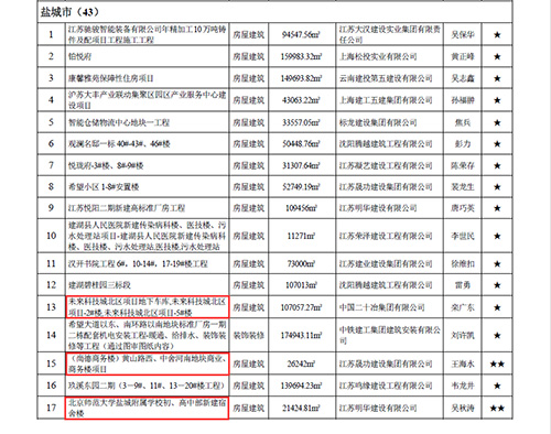 鹽城東尚德商務(wù)樓榮獲2021年度“江蘇省二星級施工標(biāo)準(zhǔn)化工地”;未來科技城北區(qū)、北師大鹽城附校(初、高中部)新建宿舍樓榮獲2021年度“江蘇省一星級施工標(biāo)準(zhǔn)化工地”。