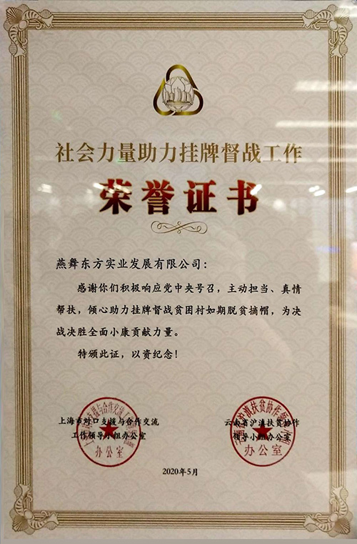 燕舞東方實業(yè)發(fā)展有限公司獲得社會力量助力掛牌督戰(zhàn)工作榮譽證書。
