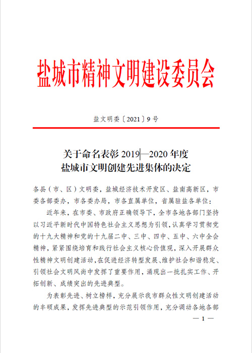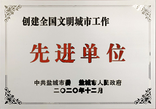 集團榮獲中共鹽城市委、鹽城市人民政府頒發(fā)的“創(chuàng)建全國文明城市工作先進(jìn)單位”獎項。