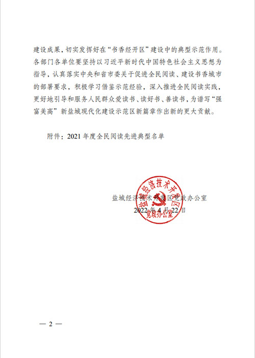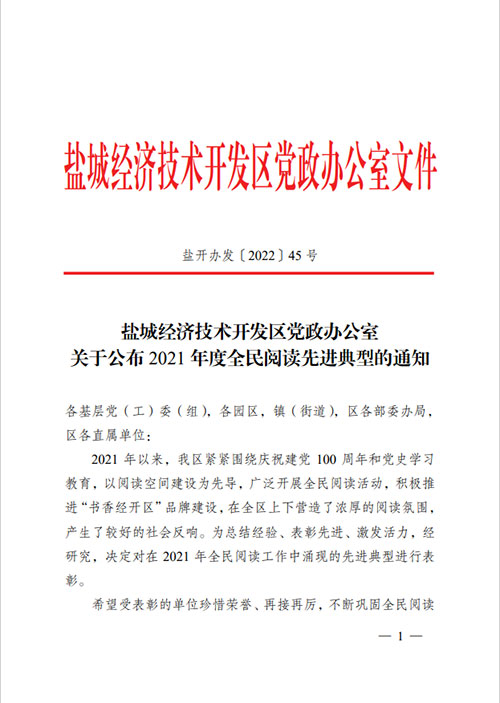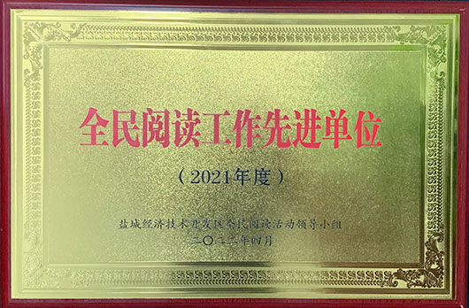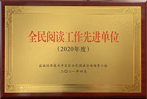 集團榮獲鹽城經(jīng)開區(qū)全民閱讀活動領(lǐng)導(dǎo)小組頒發(fā)的2020年度“全民閱讀工作先進(jìn)單位”獎項。